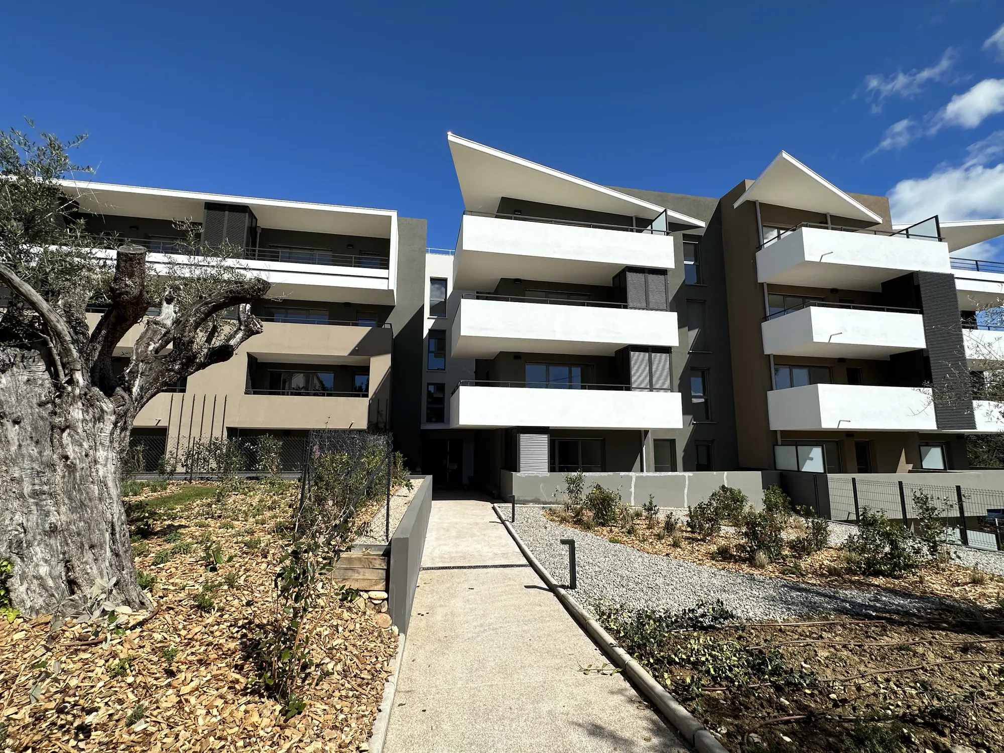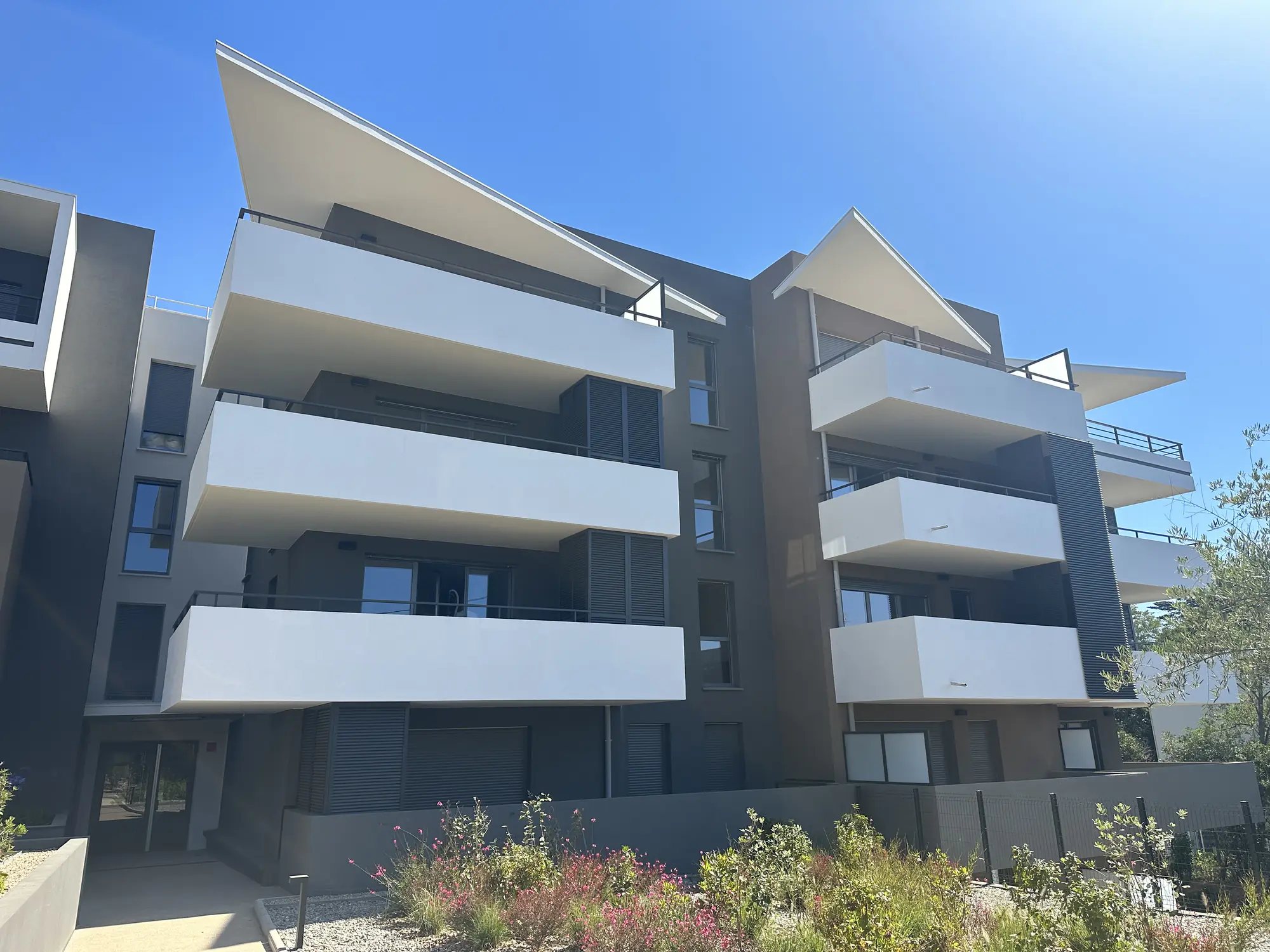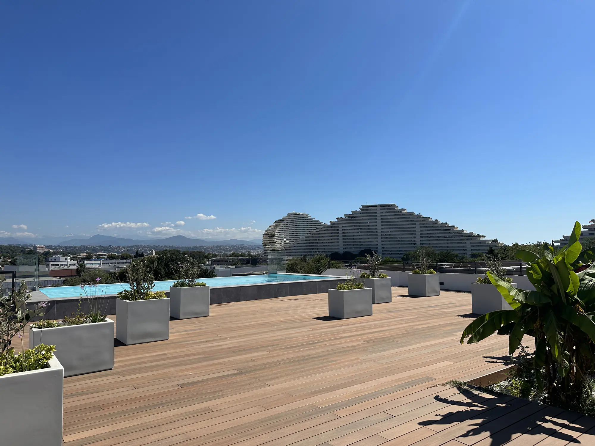 Résidence mixte de 85 logements, dont 43 locatifs sociaux, située au cœur du quartier des Maurettes à Villeneuve-Loubet, avec piscine en toiture et vue mer.