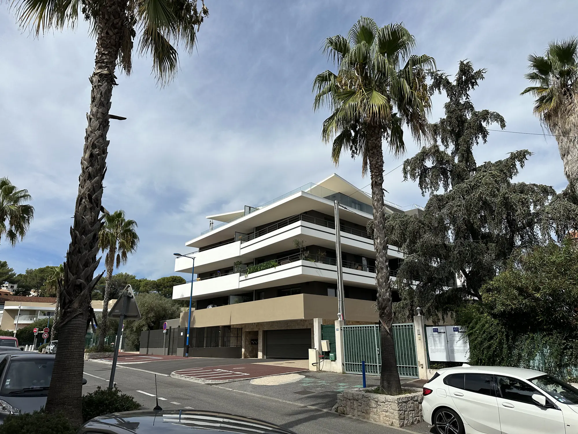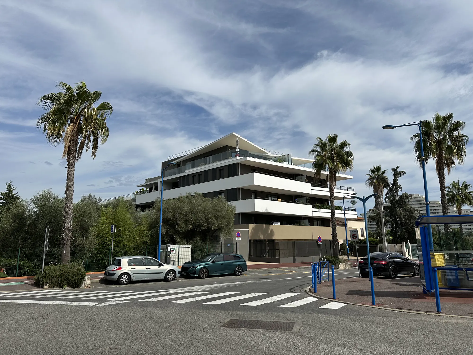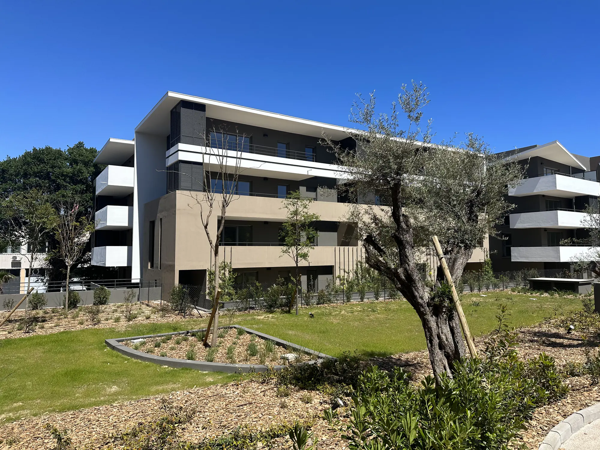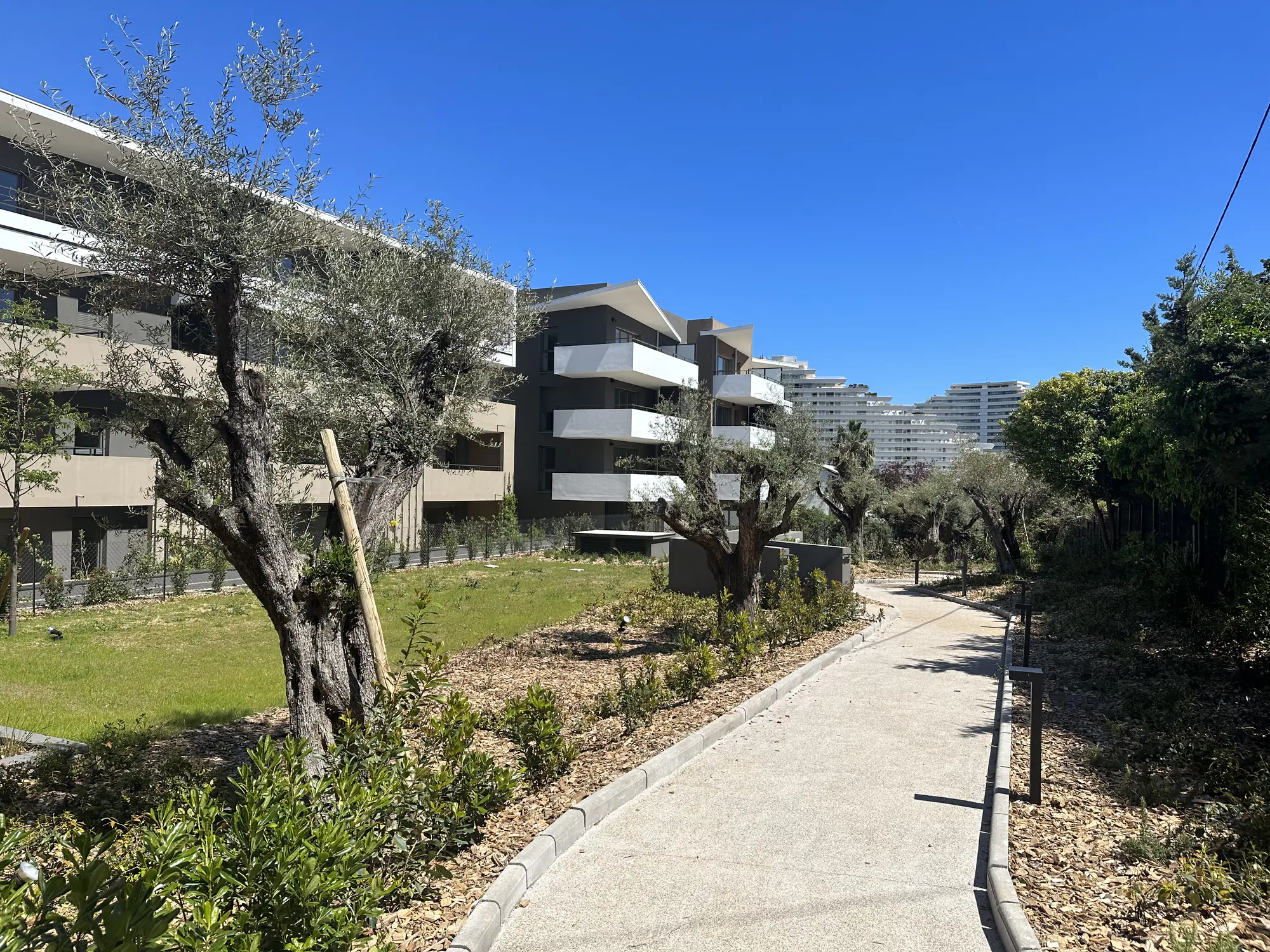 Résidence mixte de 85 logements, dont 43 locatifs sociaux, située au cœur du quartier des Maurettes à Villeneuve-Loubet, avec piscine en toiture et vue mer.